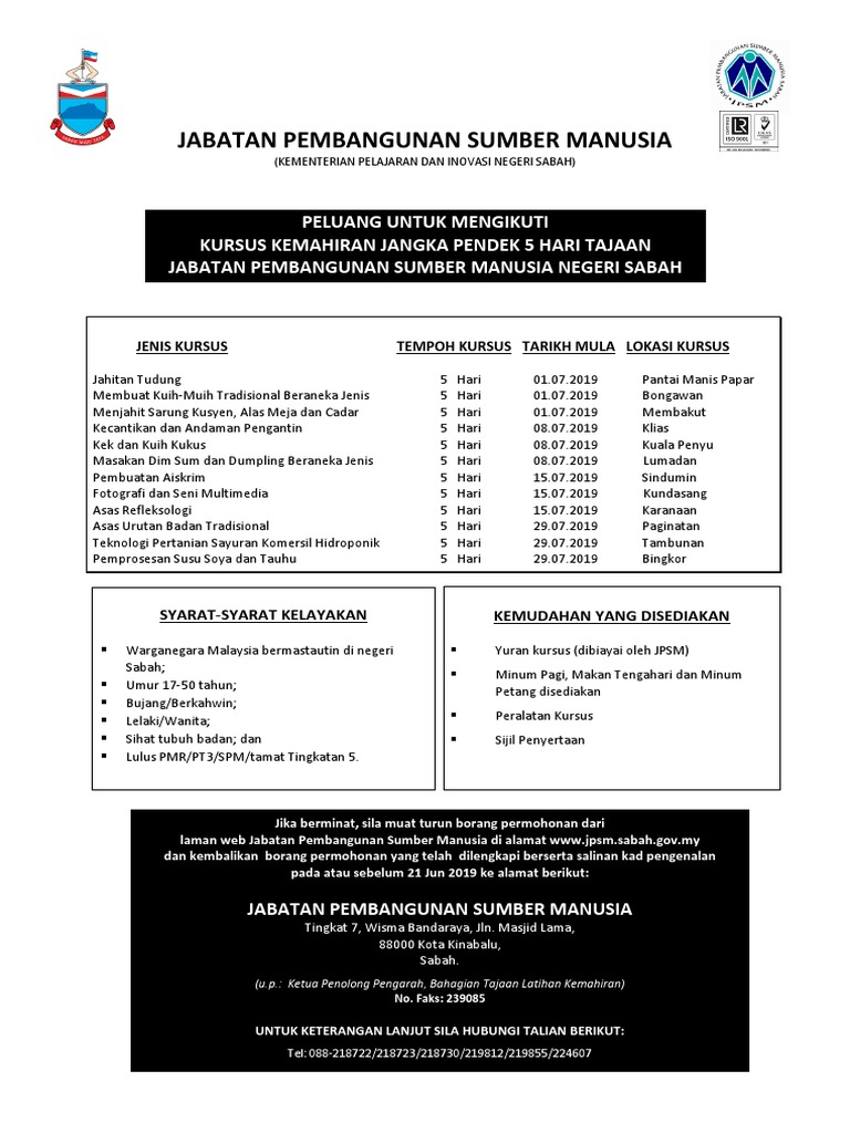 Jabatan Penerangan Negeri Sabah On Twitter Kursus Kemahiran Jpsm Sabah Para Belia Tempatan Sabah Lepasan Sekolah Menengah Yg Memenuhi Syarat Kelayakan Adalah Dipelawa Utk Menghadiri Temuduga Terbuka Kursus Kemahiran Tajaan