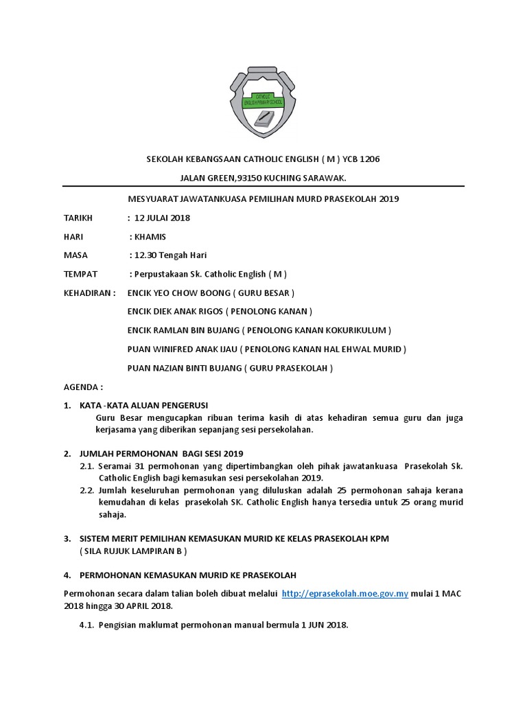 Minit Mesyuarat Pemilihan Kemasukan Prasekolah Sesi 2019