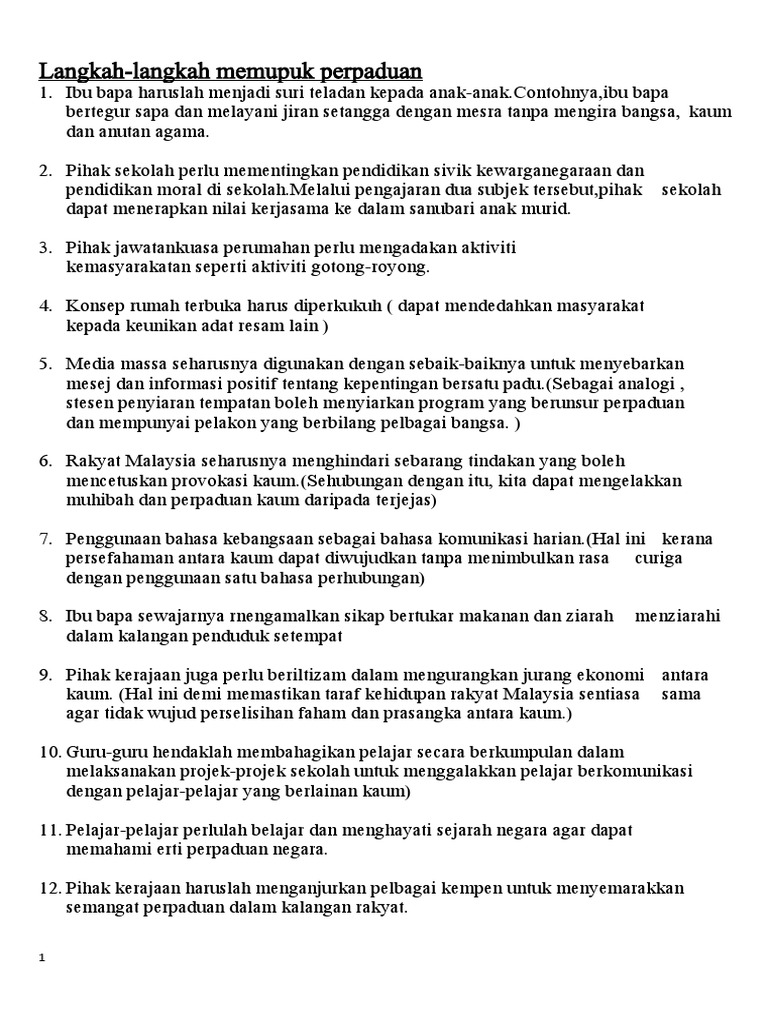 Doc Langkah Mengukuhkan Perpaduan Dalam Kalangan Rakyat Malaysia Amirah Muhamad Kahiri Academia Edu