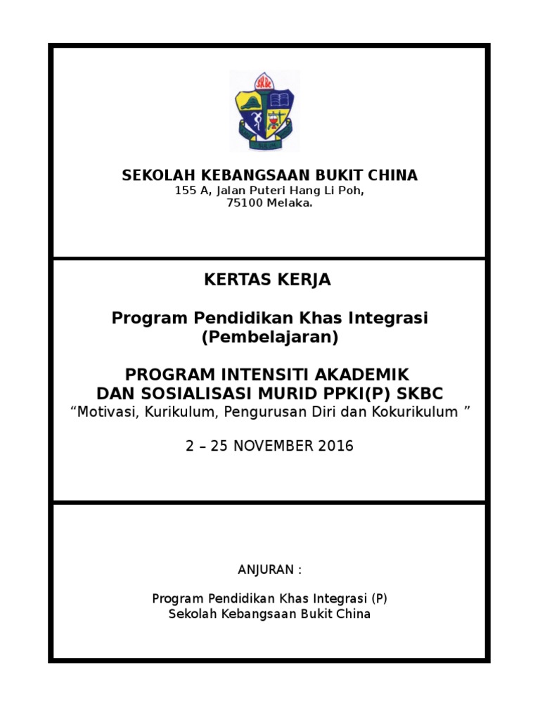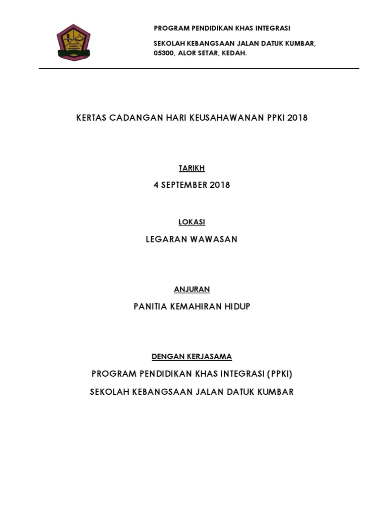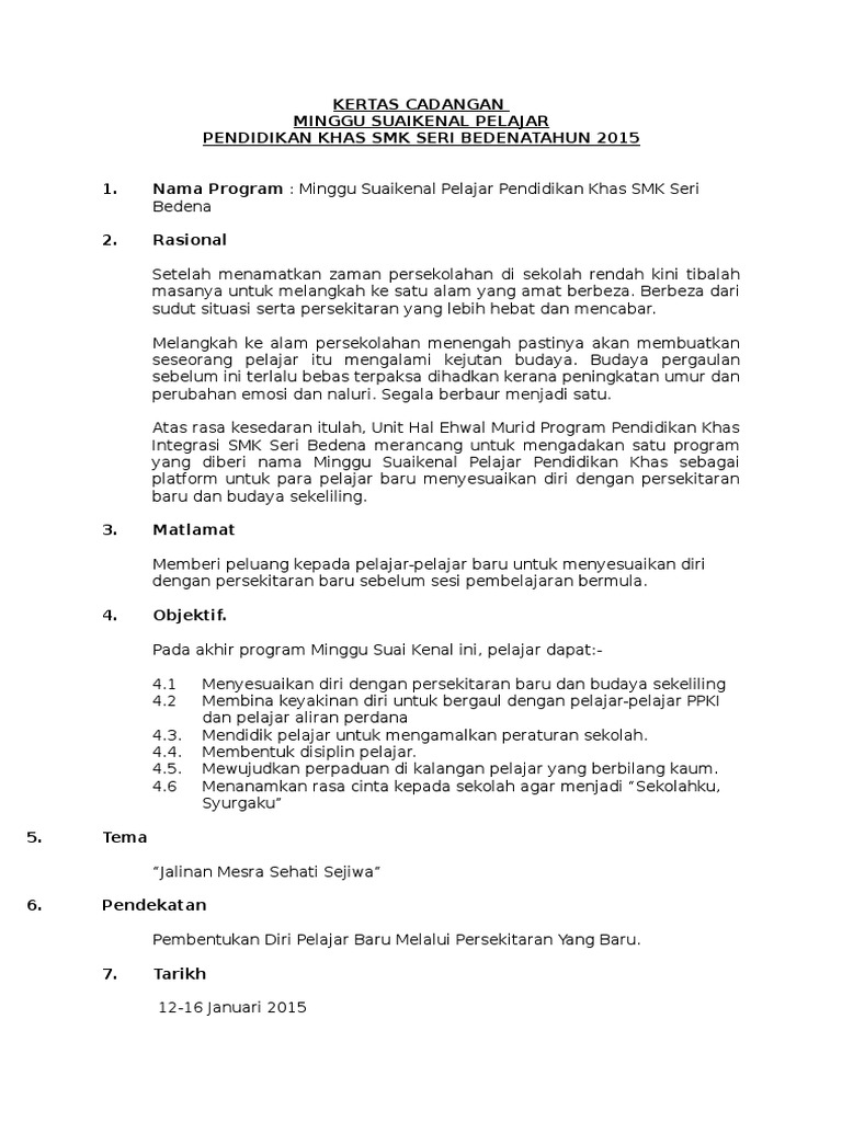 Kertas kerja ini dikemukakan untuk mendapatkan pertimbangan dan kebenaran daripada pengetua sekolah menengah kebangsaan kampong jawa bagi menjalankan minggu pendidikan khas intergras mpki program mpki merupakan program tahunan yang diadakan di peringkat negeri mahupun peringkat kebangsaan bertujuan memberi pendedahan kepada warga sekolah ibu bapa murid murid istimewa tentang program program. Bahan rpt kssmpk ting 1 2017. Ppd timur laut. Mcmn caranya utk sy dptkn cth kertas kerja yg tiada pd pautan tu cikgu.