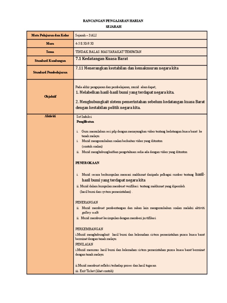 7 1 Kedatangan Kuasa Barat Rancangan Pengajaran Harian Sejarah Mata Pelajaran Dan Kelas Masa Tema Standard Kandungan
