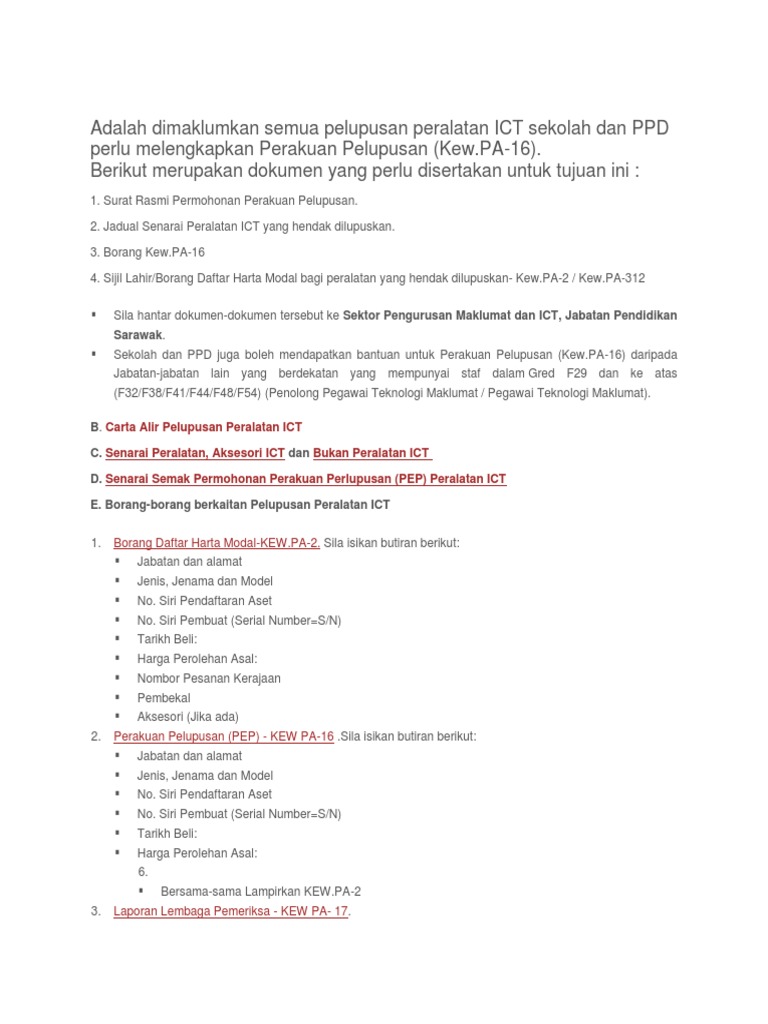 Adalah Dimaklumkan Semua Pelupusan Peralatan Ict Sekolah Dan Ppd Perlu Melengkapkan Perakuan Pelupusan Kew Pa 16 Berikut Merupakan Dokumen Yang Perlu Disertakan Untuk Tujuan Ini