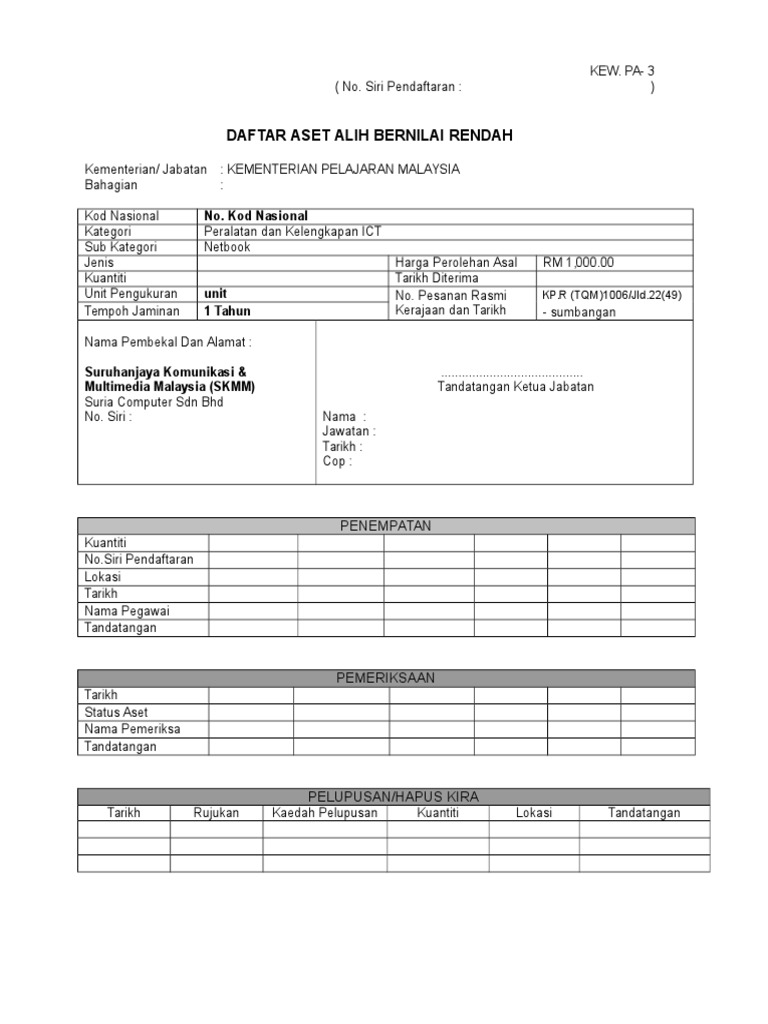 Kew Pa 3 Daftar Aset Alih Yang Bernilai Rendah