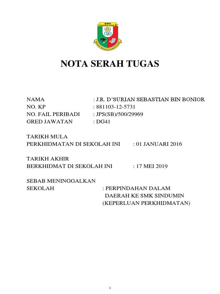 Contoh Nota Serah Tugas Perlu Diisi Untuk Guru Yang Berpindah Keluar