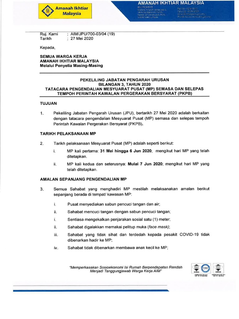 27 Mei 2020 Pekeliling Jpu Bil 3 Tahun 2020 Tatacara Pengendalian